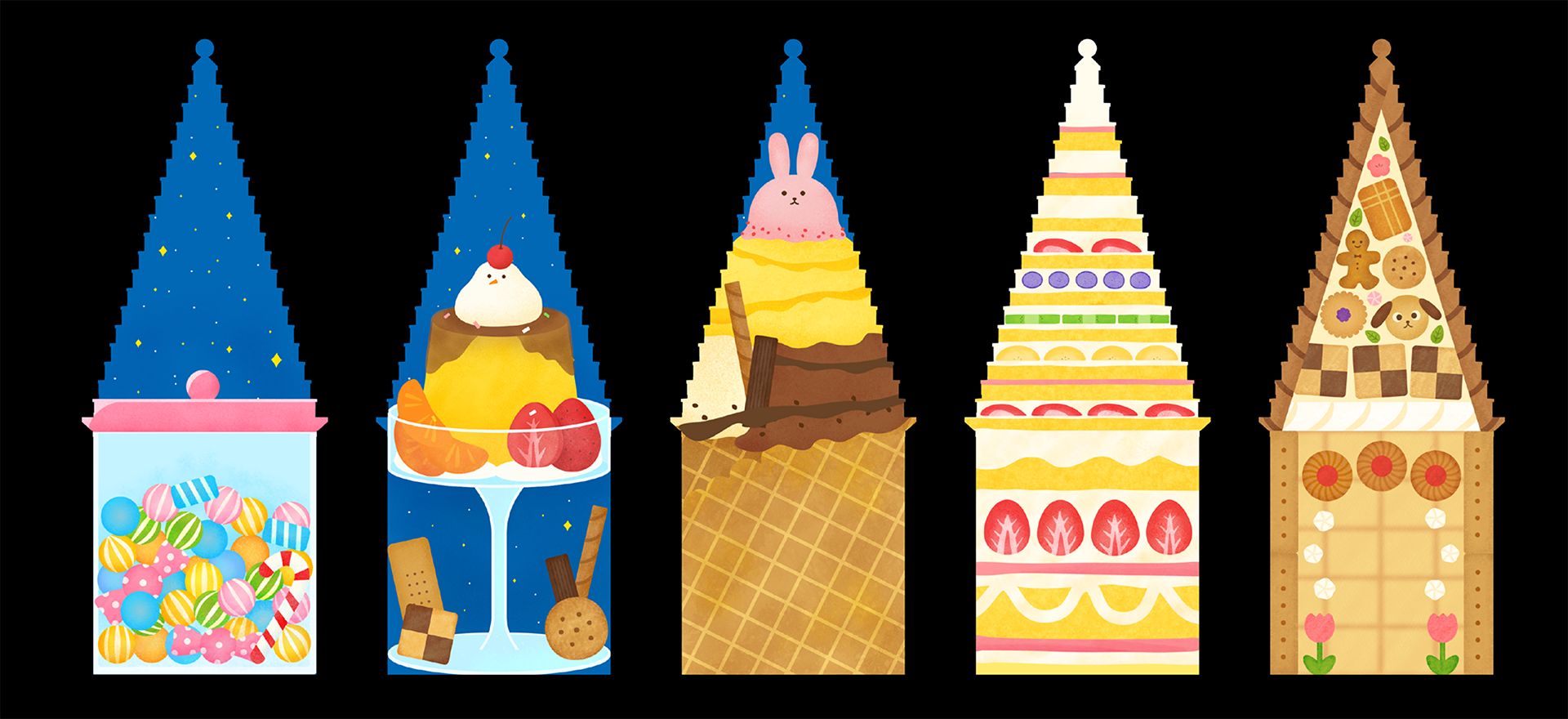 Inspired by the fantasy of a candy house, “Dessert Castle” transforms an architectural tower into a living dessert dreamscape. It begins as a colorful jar of candies, then shifts into a soft flan, ice cream, a layered cake, and finally, a cookie house. Each transformation blends texture with whimsical imagination, celebrating the joy and creativity of childhood. Through vibrant colors, soft lighting, and fluid motion, the piece turns architecture into a playground of sweetness—a place where fantasy and flavor meet.